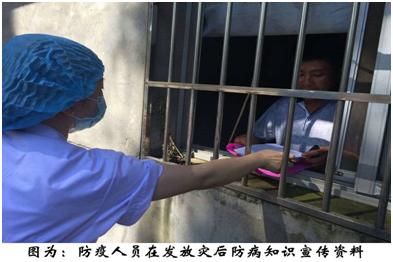 “水灾之后要清除垃圾、污物、管理好粪便,不喝生水、不吃腐败变质或被洪水浸泡过的食物。”公共卫生科室防疫人员边向村民发放卫生防病健康知识宣传单,边讲解注意事项,“没想到卫生防疫人员来得这么快。人民群众健康有保障了。”村主任曹加喜高兴地说。